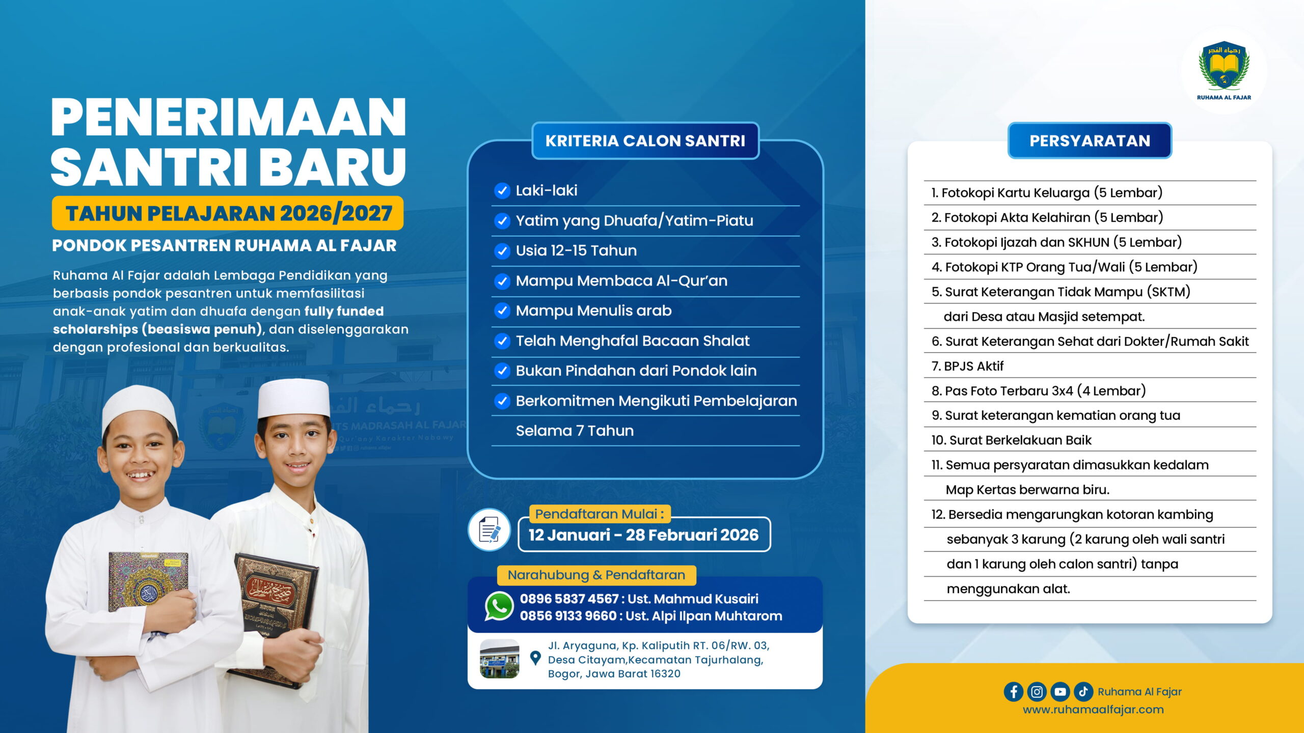 Ruhama Al Fajar. Ahad, 15 Januari 2026 — Pondok Pesantren Ruhama Al Fajar secara resmi membuka kembali pendaftaran Santri Baru untuk Tahun Pelajaran 2026/2027. Pembukaan
